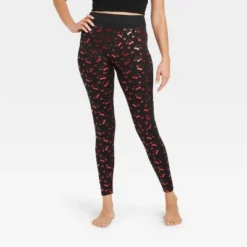 Women’s Foil Print Santa Hats Seamless Fleece Lined Leggings – Wondershop™ Black/Red